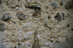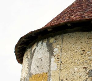 La maçonnerie est faite de moellons de silex, l’enduit de chaux et sable est à pierre vue.