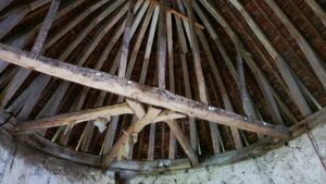 On aperçoit sur cette vue les coyaux qui prolongent les chevrons qui sont ancrés dans la poutre sablière. Ce dispositif donne ce profil si élégant au toit.