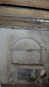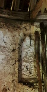 L’ouverture située au milieu de ce qui fut le chœur de la chapelle est visible à l’intérieur, on distingue bien les claveaux et il semble qu’il s’agisse d’un assemblage en arc brisé. Ceci est plus difficile à observer de l’extérieur à cause de l’enduit et de réparations en ciment gris.