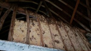 Le pan de bois est hourdé de torchis. Cette cloison est posée sur une poutre traversière. Est-ce un aménagement réalisé lorsque la chapelle est devenue une maison d’habitation ? Si cette partie de l’édifice fut aménagée pour être habitée, une panne intermédiaire a été ajoutée qui supporte les chevrons formant fermes.