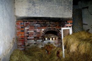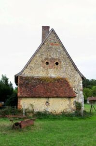A côté du logis on trouve une boulangerie, il s’agit d’une construction dédié à la préparation et à la cuisson du pain. Cet édifice aux belles proportions a été conçu et réalisé à une époque qui aura été celle de la transformation de l’ensemble bâti en ferme. Le format et l’aspect de la brique sont ceux des ouvertures du logis. Ce petit bâtiment aurait pu être contemporain de la léproserie, ce fut souvent l’usage de bâtir des lieux dédiés à la seule élaboration du pain. On peut alors supposer que ce four fut destiné à plusieurs habitations donc à plusieurs familles, ceci expliquerait l’existence d’un bâtiment spécifique.