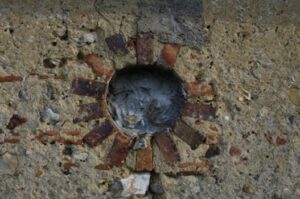 Il y a eu une troisième ouverture au sud. Le potelet qui supporte la ligne EDF est assez incongru. Placé précisément au milieu de l’ouverture murée, il traverse la couverture, sans faire de manières. Au chevet de la chapelle, cette ouverture murée est bien apparente à l’intérieur. Linteau en arc brisé à peine visible sous les raccords de ciment gris, cette ouverture est située au centre de l’édifice, dans l’axe de l’accès aménagé dans le pignon ouest. Bien visible à l’intérieur on y distingue les claveaux qui forment le linteau.
