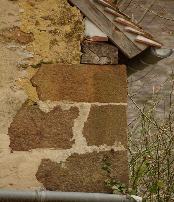 … on distingue bien l’ancien mortier « noble » qui maintient encore les moellons malgré son état très délité. Ici il est urgent de déposer le mauvais enduit, de bloquer les moellons et de ré-enduire avec un mélange : chaux aérienne + sable, en trois passages.