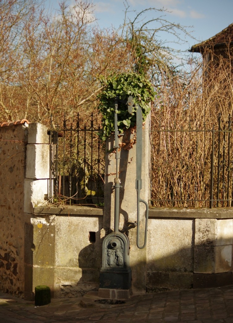Appuyée sur l’angle du mur qu’elle protège, cette borne est destinée à écarter le moyeu de la roue du chariot qui franchit le passage charretier.