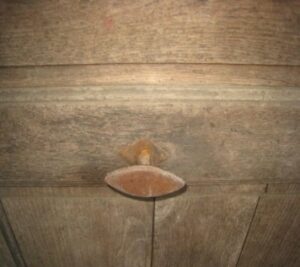 Sur l’angle de cette poutre maîtresse (elle a été peinte, hélas) une moulure à profil semi-circulaire témoigne à la fois de son ancienneté et en même temps du soin qu’on a apporté à sa confection.