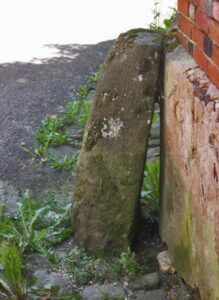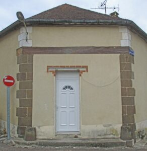 Appuyée sur l’angle du mur qu’elle protège, cette borne est destinée à écarter le moyeu de la roue du chariot qui franchit le passage charretier.