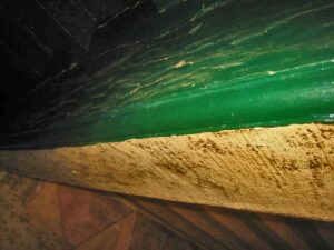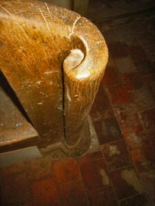 Sur l’angle de cette poutre maîtresse (elle a été peinte, hélas) une moulure à profil semi-circulaire témoigne à la fois de son ancienneté et en même temps du soin qu’on a apporté à sa confection.
