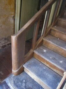 Escalier droit en bois, la simplicité de la rampe et des balustres ajustées en fait l’élégance discrète.