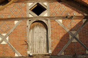 Rue Sébastien Jobin, cette grange remarquable, le pan de bois, la brique et la pierre de taille calcaire en constituent la maçonnerie.