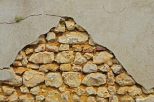Le mur dégradé, les effets d’un enduit de mortier bâtard sont ici caricaturaux.