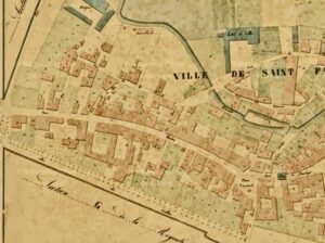 En 1834 la gendarmerie n’est pas encore construite, l’hôtel de ville d’alors est logé dans ce qui fut le couvent des Augustins. De l’autre côté du Bourdon se dressait une maison qui pourrait bien être celle qui existe encore, en mauvais état car enduite d’un mauvais mortier au ciment gris, elle est aujourd’hui menacée de destruction.