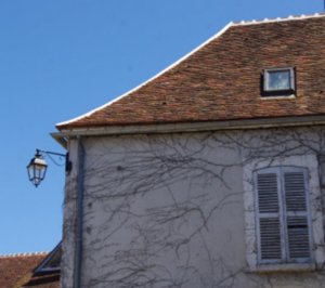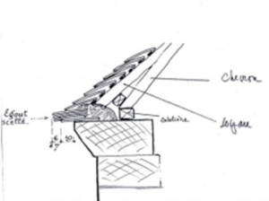 La tuile plate. Elle est légèrement bombée, au format local (16 x 25 cm), un seul ergot au dos permet de la caler sur la latte de bois fendu qui est clouée sur le chevron. Les tuiles faîtières ne sont pas emboitées mais scellées au mortier de chaux grasse, en crète de coq. La gouttière est une invention récente, elle permet de recueillir l’eau et de la conduire vers une citerne ou bien le caniveau en ville, le fossé, la mare à la campagne, c’est selon. Ici la ligne de toit s’incurve, un coyau est posé au bout des chevrons. Ce dispositif provoque une légère rupture de pente, l’eau qui ruisselle sur les tuiles accélère en fin de course et s’éloigne de la maçonnerie. Ceci pouvait rendre la gouttière inutile. Sur cette maison de ville la gouttière évite aux passants de recevoir la douche lorsqu’il pleut, elle devient une simple question de courtoisie.
