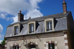 L’ardoise légère. Elle est indispensable sur les maisons bourgeoises que le dix-neuvième siècle nous a léguées. Ci-dessus la couverture est à quatre pentes, l’eau de pluie est recueillie dans un chéneau qui est intégré dans la corniche. Il disparaît ainsi, à peu près. Le zinc accompagne l’ardoise, sur les arêtiers, sur la lucarne, en pied des souches de cheminée, en épi de faîtage avec ici les quatre points cardinaux, pour ne pas perdre le nord.