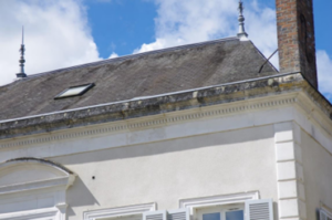Terrasson et brisis pour ce toit à la Mansard, la brique se mêle à la pierre et une gouttière laisse paraître la corniche qui se montre quand même.