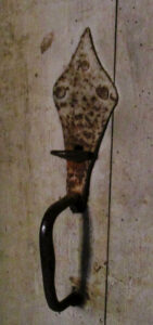 Poignée et poussoir à bouton, le tout maintenu par des clous forgés à tête de diamant